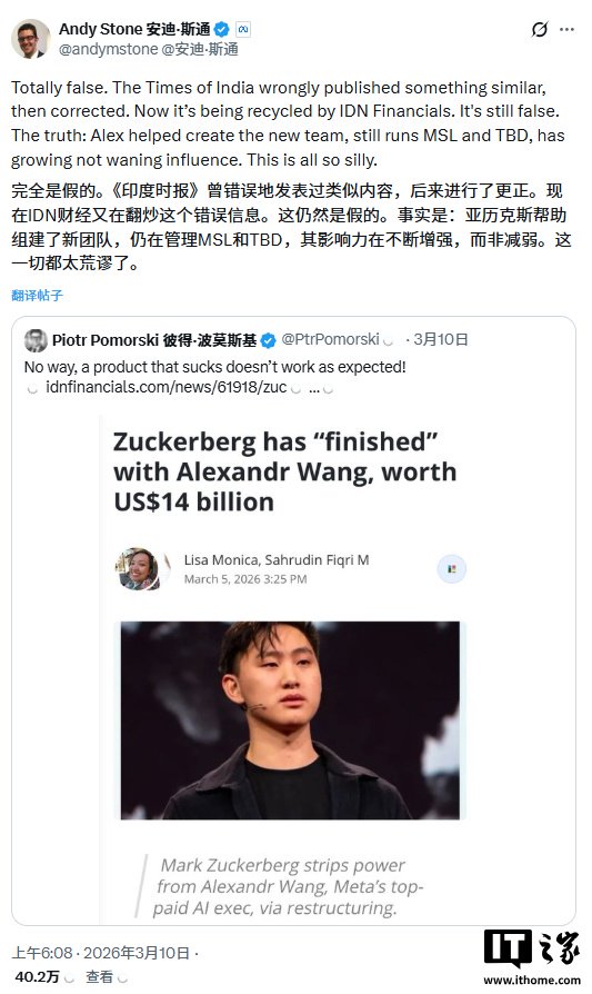 近日,《华尔街日报》报道称,Meta 对其人工智能架构进行了重组,新成立了一个应用人工智能工程师团队。去年夏天,Meta 在向亚历山大 · 王的数据标注公司 Scale AI 投资超 140 亿美元(IT之家注:现汇率约合 962.72 亿元人民币)、获得其 49% 股份后,聘请他担任首席人工智能官。但据《华尔街日报》消息,这个全新的应用 AI 团队独立于亚历山大 · 王的团队,直接向首席技术官安德鲁 · 博斯沃思汇报。